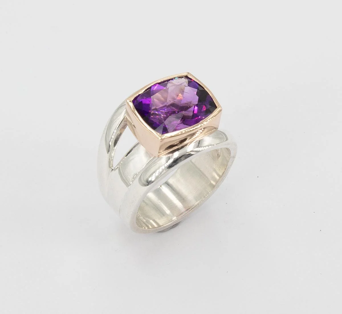 The amethyst is beautifully showcased in the 9ct rose gold rub-over setting, atop the unique flow-up split design sterling silver shank.