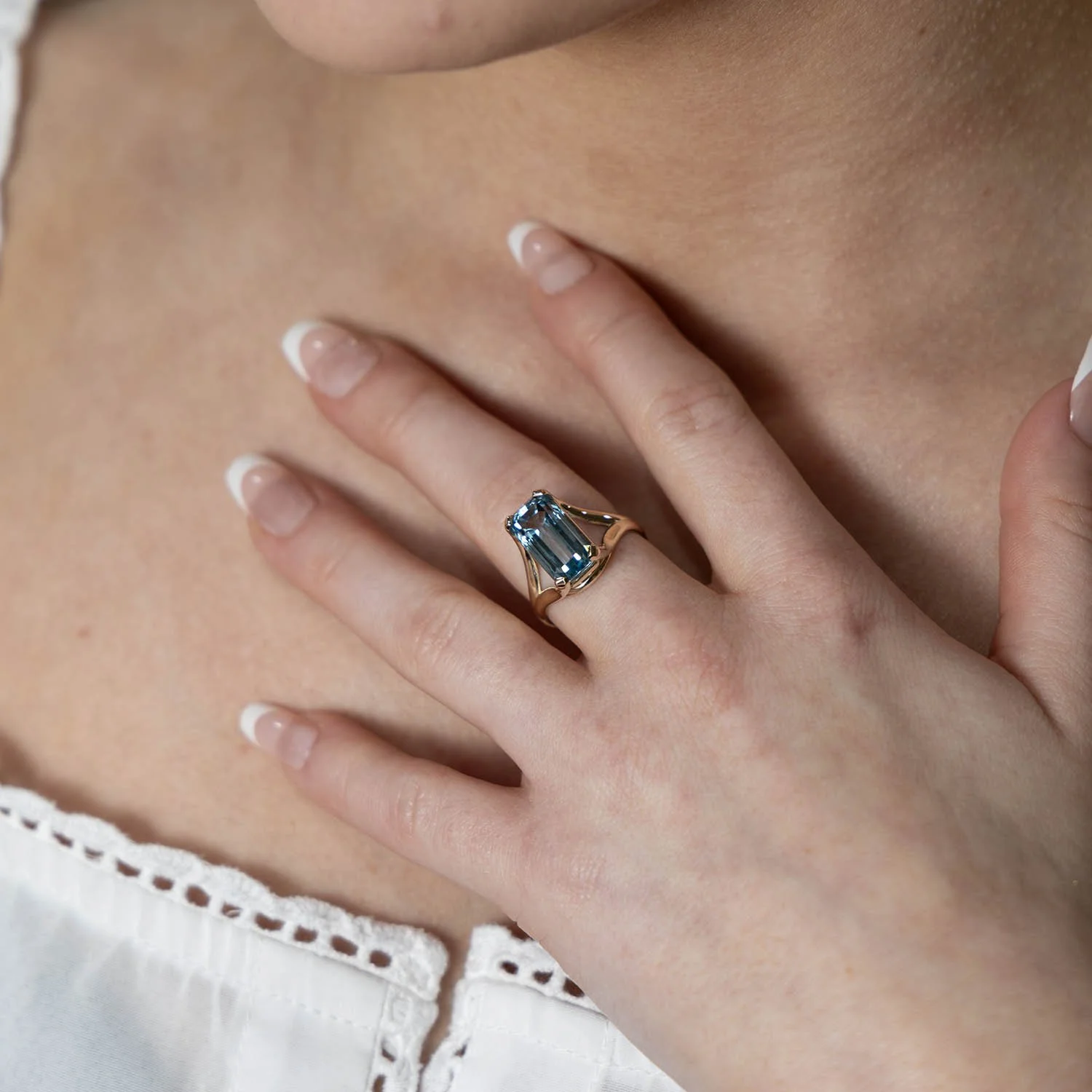 This exclusive 9ct yellow gold ring features a beautiful substantial emerald-cut Swiss blue topaz (14.7x7.2mm) in a four claw setting with collet flowing up from shank.