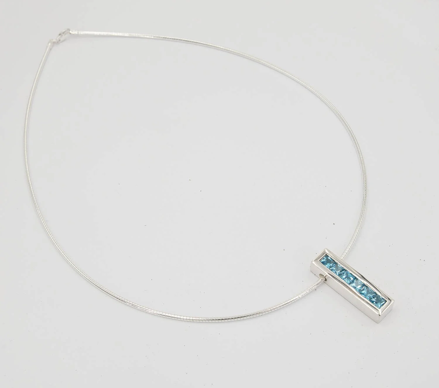 This exclusive sterling silver rectangular drop pendant perfectly showcases six stunning square-cut Swiss blue topazes (4mm each) in a channel setting.